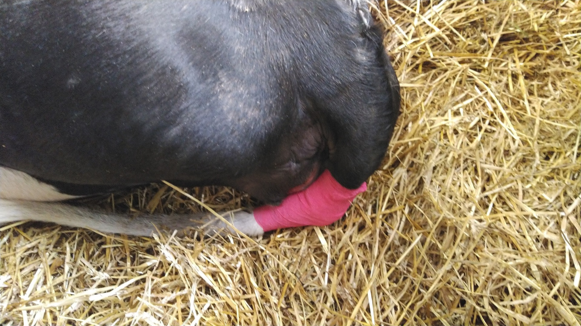 更に、この冬にオプションの分娩探知のセンサーも導入しました。これは、一般的な体温を計測したり陰部に注入したりするものでなく、尻尾に装着するタイプになります。 尻尾に装着?とその機能に疑いの眼差しが無かったわけではないのですが、違った意味で期待を裏切ってくれました。