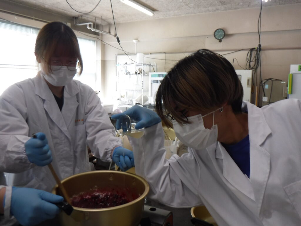 右:夏の間に栽培した作物で商品開発加工実習。ナスジャムの研究はつづく!