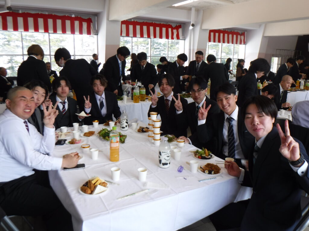 集合写真と卒業式後の会食風景。