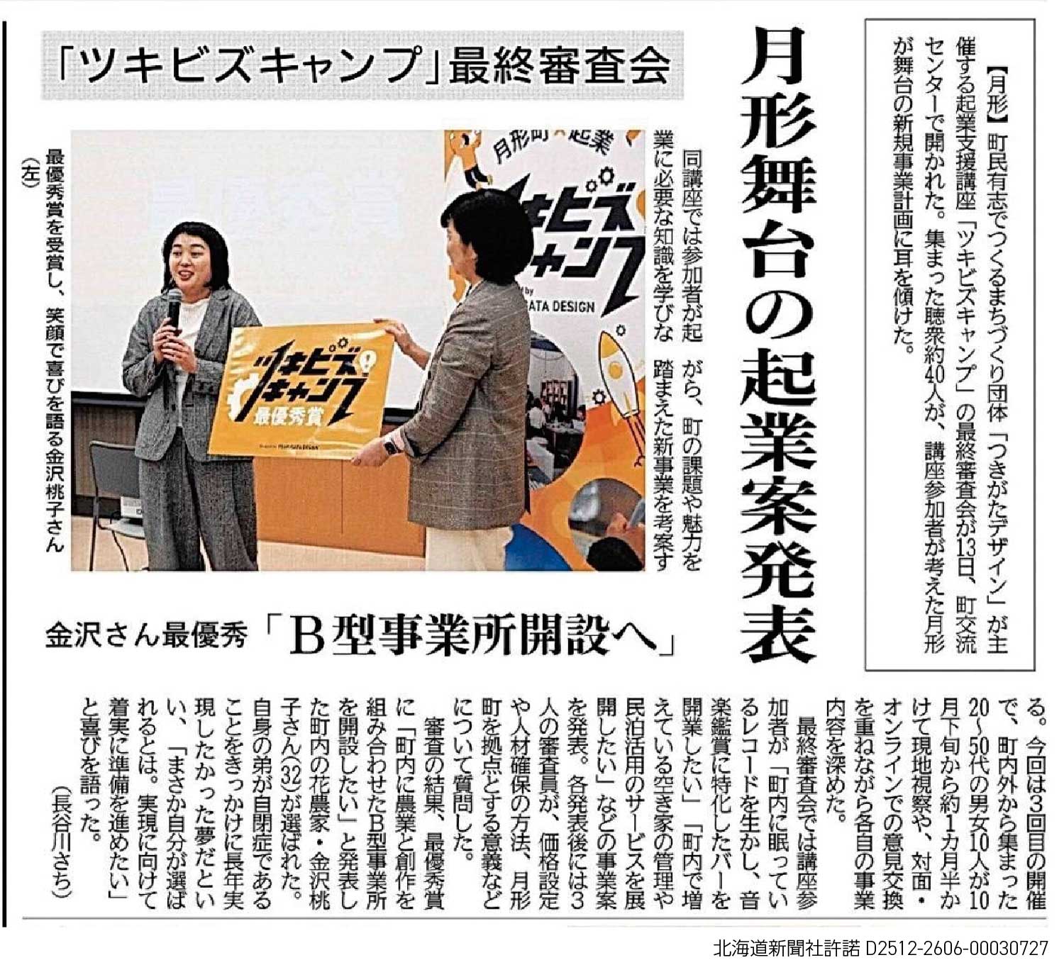 月形町での開業・起業を目的とした育成プログラム「ツキビズキャンプ」の最終審査会にて、農業と創作を組み合わせたB型事業所「青い花」の起業プランが最優秀賞を受賞。金沢桃子さん(旧姓 小原):北海道農業専門学校 78期卒(花き科専攻)。月形町地域おこし協力隊を経て、2025年度切花生産者として月形町で新規就農。切花農家だけでなく、将来農業と創作を組み合わせたB型事業所「青い花」の起業を計画している。