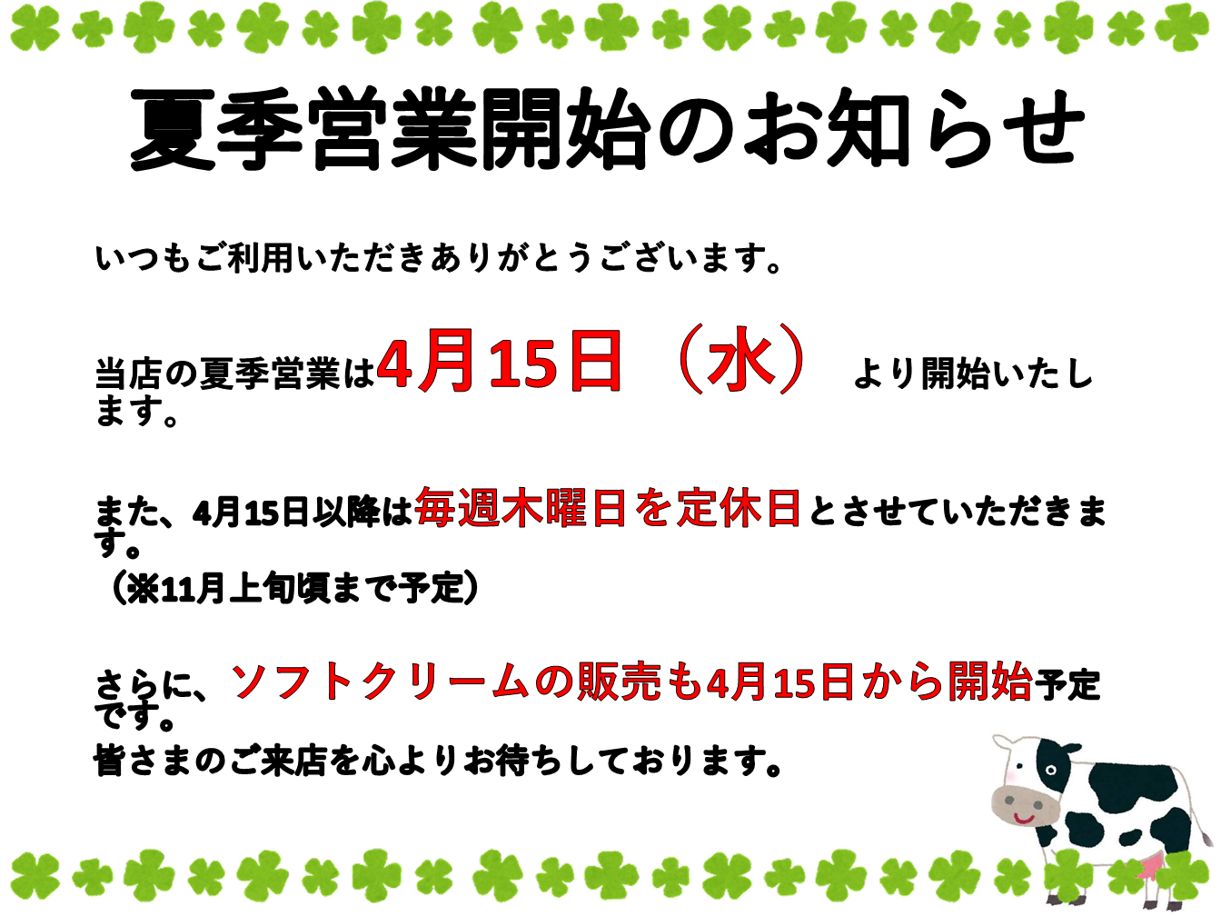 なお、4月15日以降は毎週木曜日を定休日とさせていただきます。(営業は11月上旬頃までを予定しております)